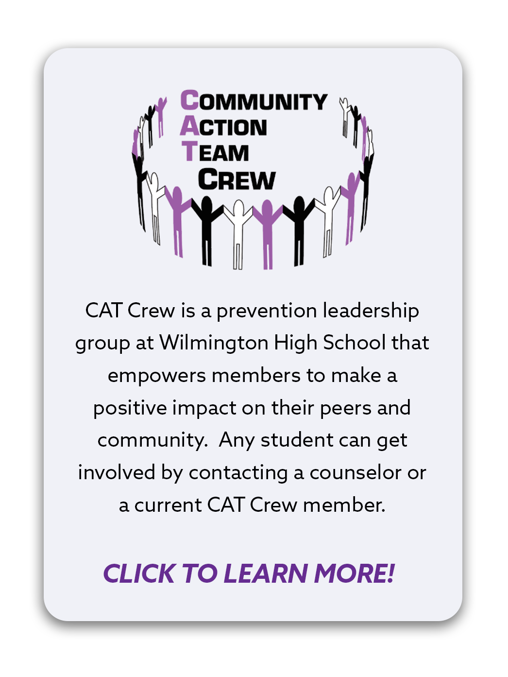 The CAT Crew is a Wilmington High School group that empowers members to make a positive impact on fellow students and the entire community. Supported by the WCHC, CAT Crew members receive training in prevention-related areas and plan activities to promote healthy behaviors, good decisions-making, and positive futures.