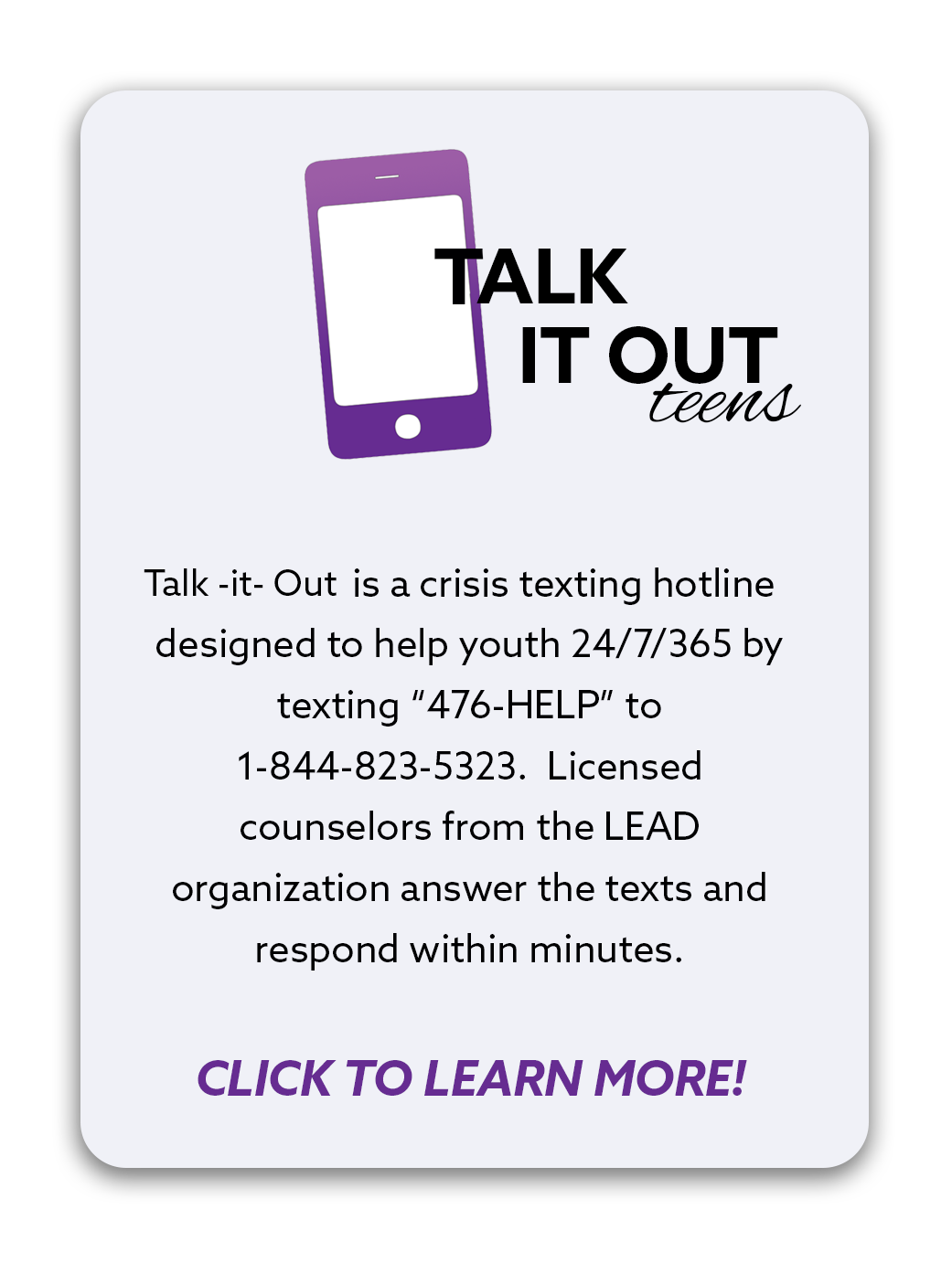 Text-A-Tip offers a free and confidential way for Wilmington teens to reach out for advice and help from a licensed counselor. Middle and high school students can text “476-HELP” to 1-844-823-5323 at any time, 24/7/365, to get help with issues like anxiety, grief, bullying, substance use, and more. Adults may also use the texting service to report concerns.